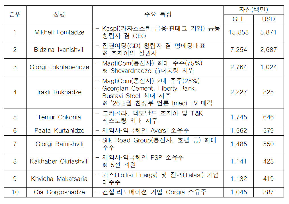 o 포브스 조지아(Forbes Georgia)는 3.23(월) 조지아 자산가 100인 순위를 발표한바, 상위 자산가들의 총 자산은 약 601억 라리(224억불)로 국가 GDP의 약 60% 및 재정수입의 3배에 달하는 것으로 나타남.